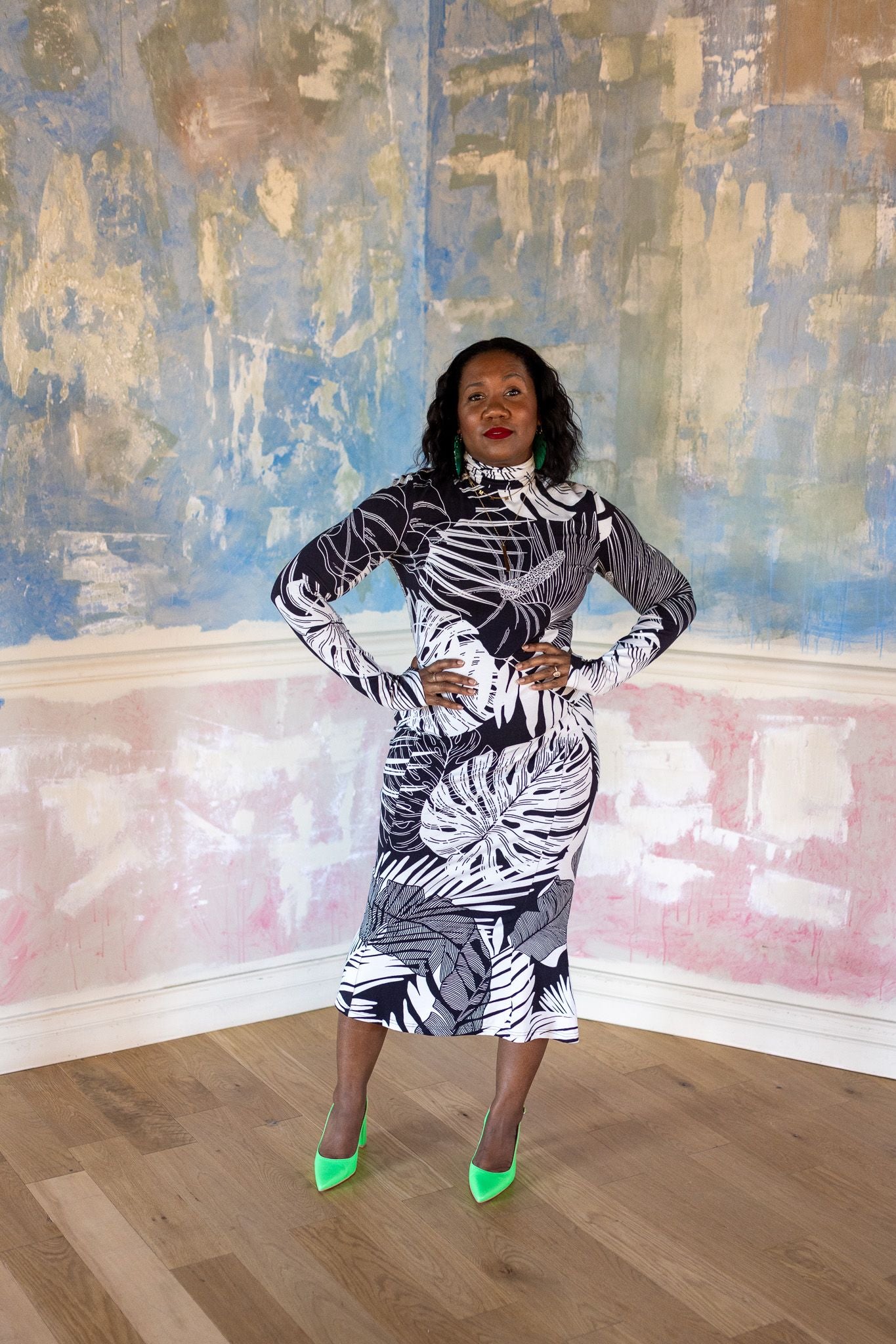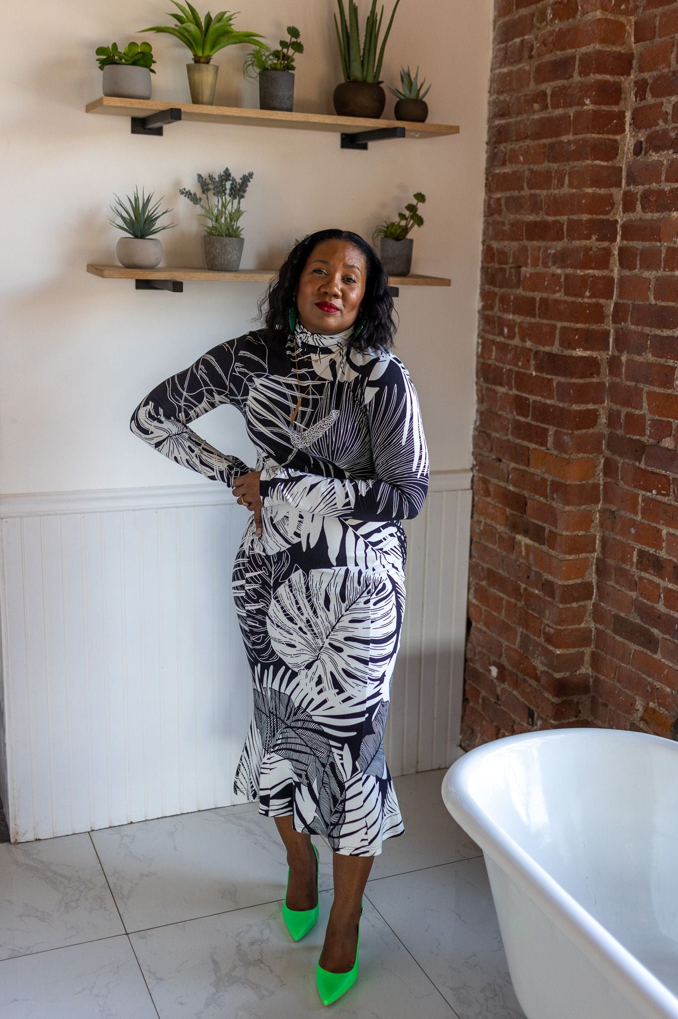 You won't be able to hide in the corner when wearing our beautifully printed Turtleneck Whitney Dress. With extra long sleeves, side panels and the perfect amount of flounce at the bottom, this dress will definitely turn heads!